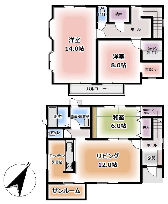 | 間取り内訳 | 1階LDK17畳1室 1階和室6畳1室 2階洋室8畳1室 2階洋室14畳1室 +サンルーム |