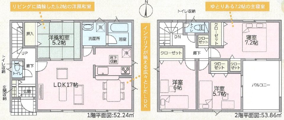 | 間取り内訳 | 1階LDK17畳1室 1階和室5.2畳1室 2階洋室5.7畳2室 2階洋室6畳2室 2階洋室7.2畳2室 |