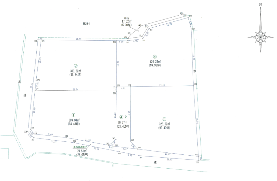 | 設備・条件 | プロパンガス 公営水道 排水浄化槽 ●上水道負担金80万円別途要●1,3,4号地からの開発●4号地の延長敷地は無償譲渡(地役権設定予定無し) ●①号地:309.04㎡(約93.48坪)@9万円¥8,413,200 ●②号地:303.62㎡(約91.84坪)@8.6万円¥7,898,240 ●③号地:328.62㎡(約99.40坪)@8.2万円¥8,950,800 ●④号地:330.34㎡(約99.93坪)@7.8万円¥7,794,540 | ||